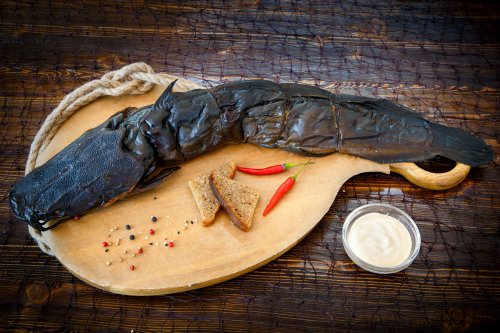 Сом мраморный потрошеный с головой (горячего копчения)